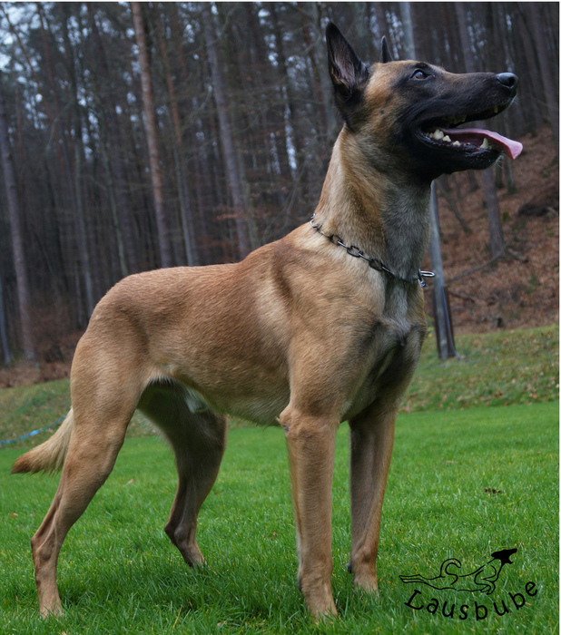24 Monate alter, maskuliner Rüde von gutem Typ, gelbroter Farbe, gute Charbonage, korrekte Maske, komplettes Scherengebiss, guter Kopf, Fang mit schöner